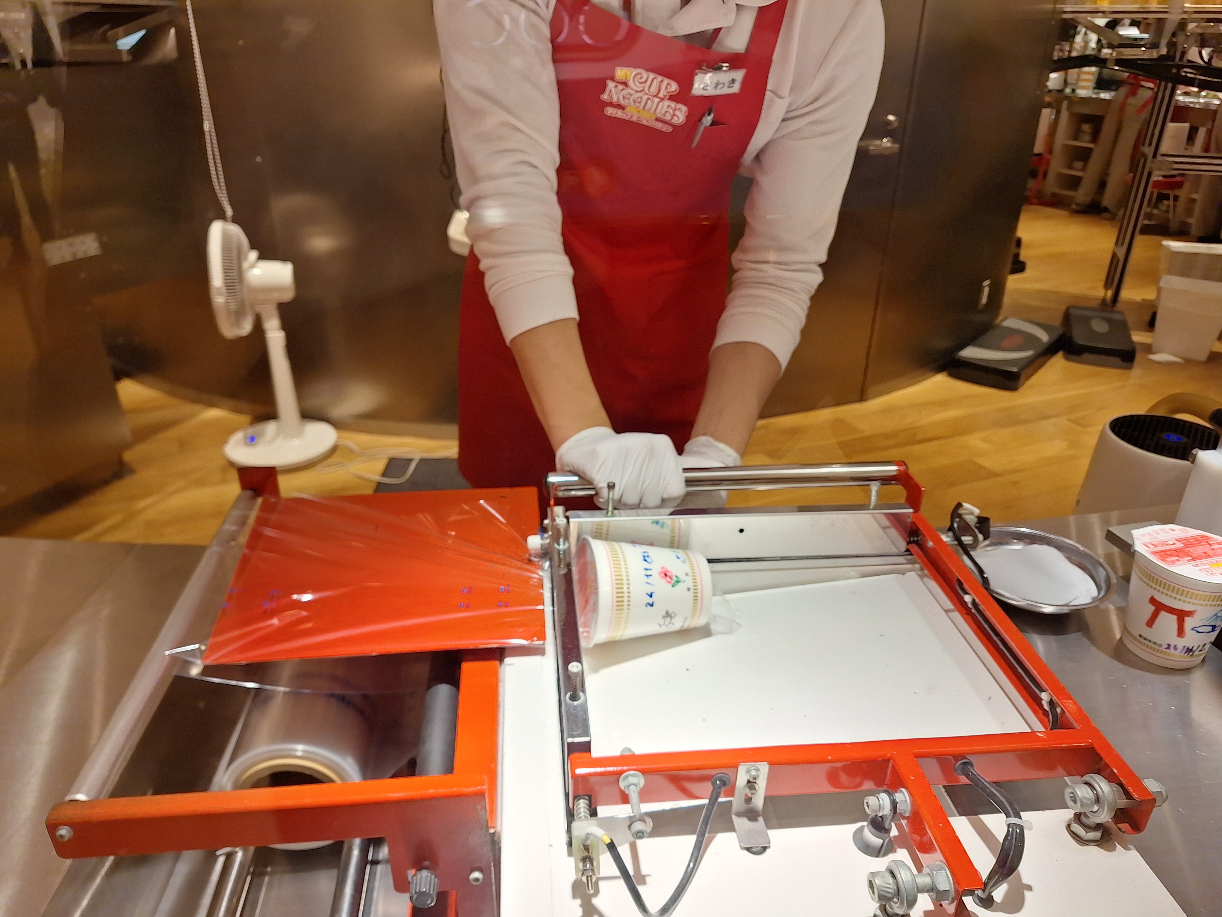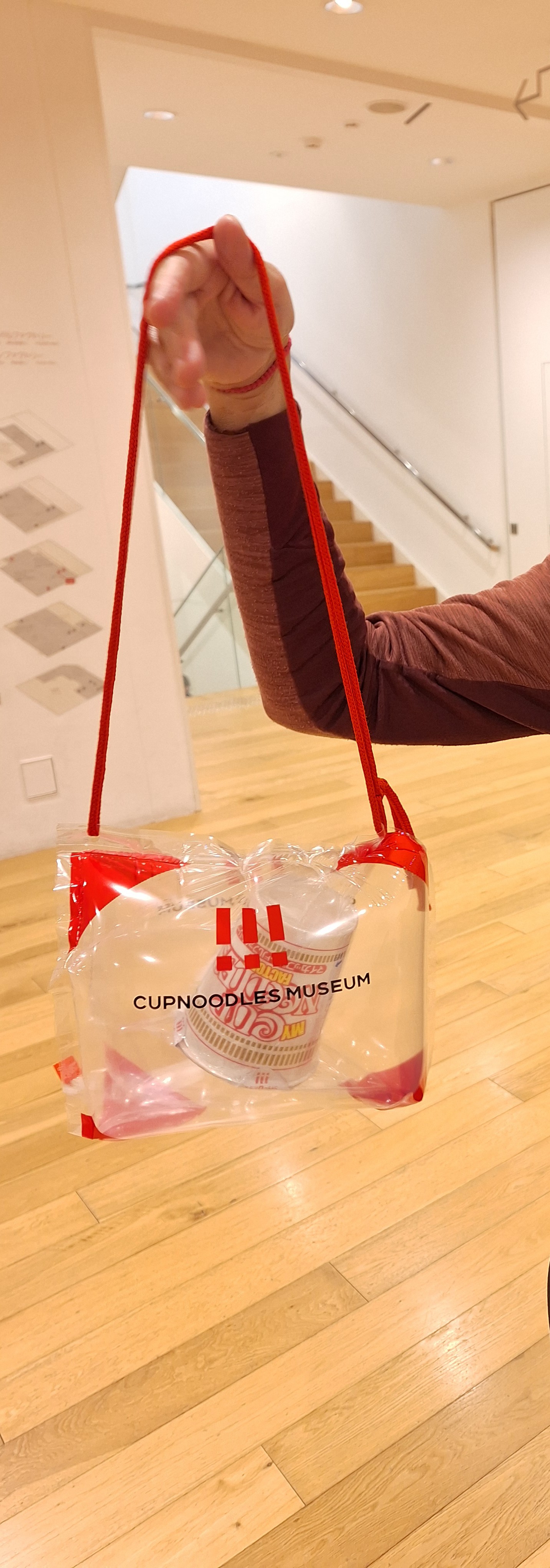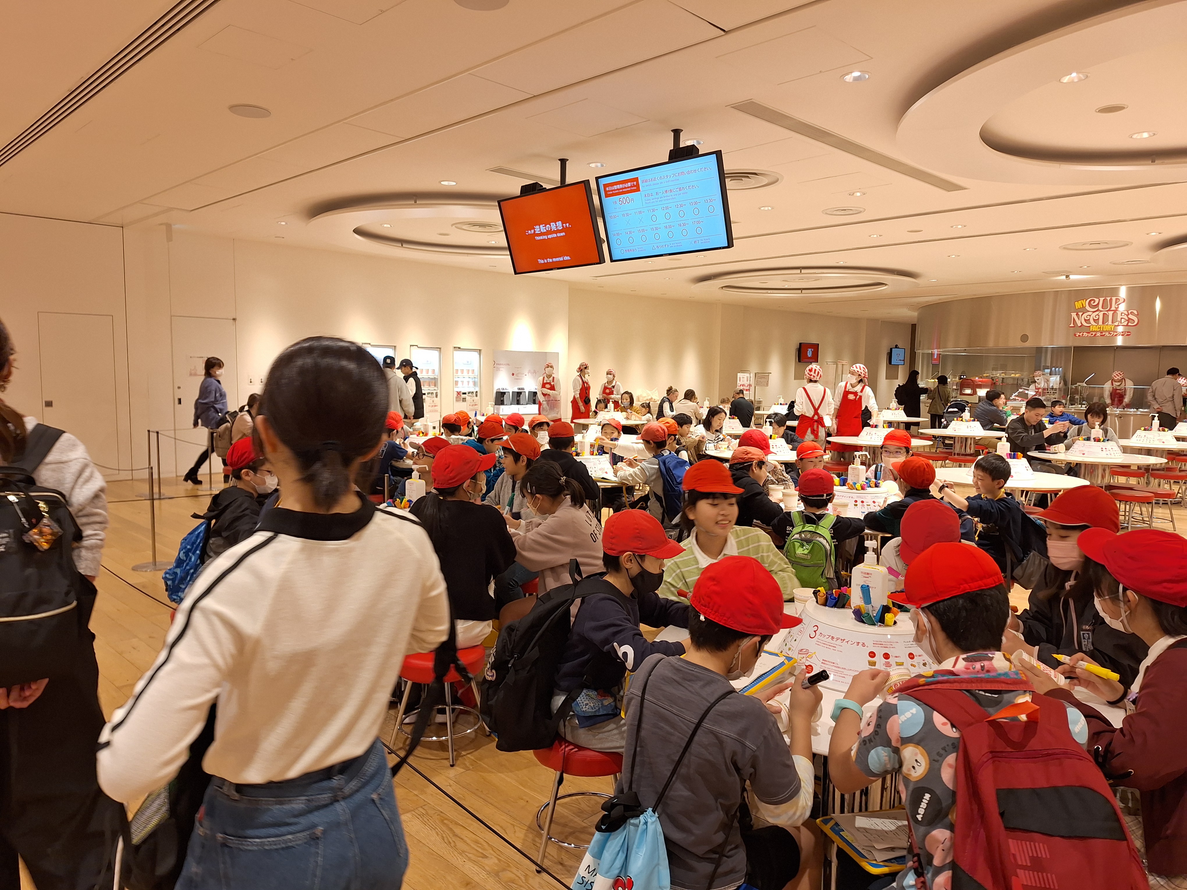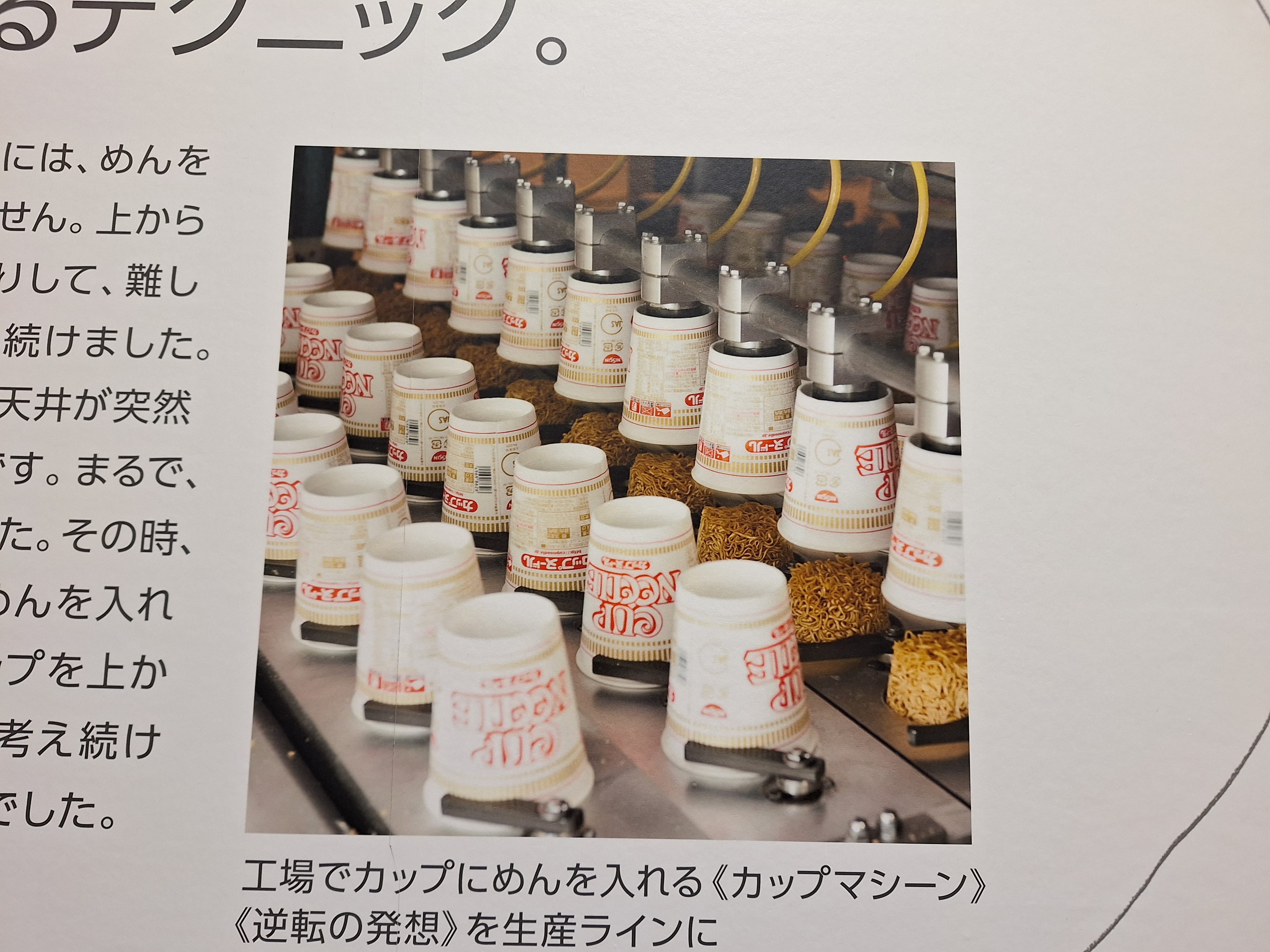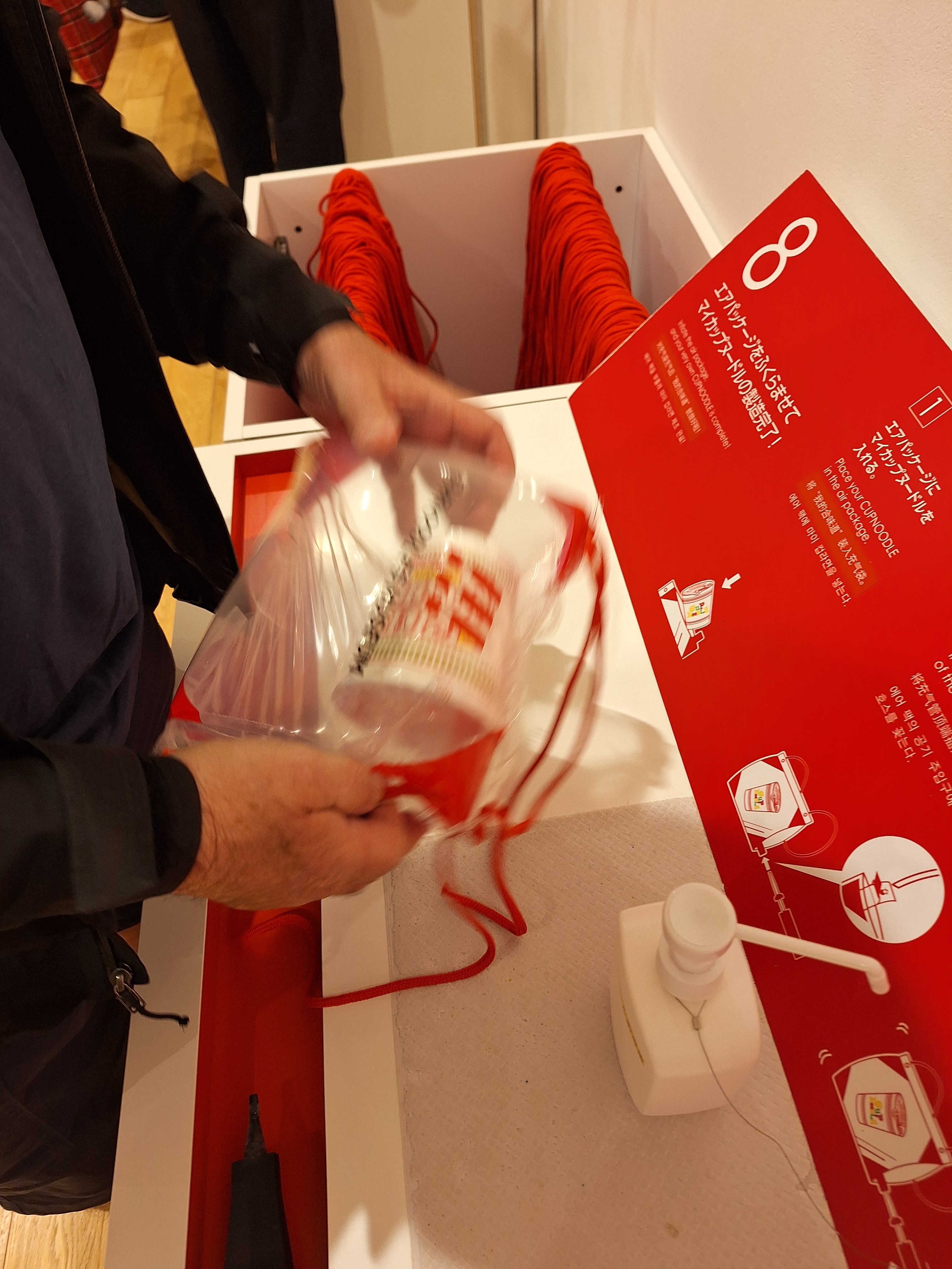 Plus tard, en 1971, il commercialise les nouilles en tasse et la paire de baguettes (donnée à chaque fois que vous achetez une soupe). Il est persuadé que « la paix viendra au monde quand les gens auront assez à manger ».800 types de plats différents. Pour donner une idée du succès de l’invention, en 2007, 70 milliards de portions ont été vendues! La cabane s’est agrandie.Les nouilles prennent le large vers les USA en 1973 avec des saveurs nouvelles, puis ce sera vers le Brésil, Singapour, Hong Kong, l’Inde…Puis elles prirent de la hauteur en 2005 ! On ne fait plus la livraison à vélo. Traduction : À l’intérieur de la station spatiale internationale, l’astronaute Soichi Noguchi mange des ramen de nourriture spatiale. Un régal visiblement.Des centaines d’écoliers viennent découvrir l’histoire des soupes qu’ils voient tous les jours dans les supérettes. Ils sont inscrits pour faire leur propre mixture. À cette étape, il faut décorer son gobelet.On a évidemment préparé nous aussi notre bol de nouilles. C’est la tête en bas que le bol récolte le pack de nouilles. On a choisi quatre ingrédients ……qui sont ajoutés sur les nouilles bien compactes.La dame filme notre pot. Il n’y aura plus qu’à ajouter de l’eau chaude. Il faut ensuite fabriquer son sac pour le transport. Un sac à usage unique…le Japon ne lésine pas sur le gaspillage du plastique. On a gardé les cordons rouges qui nous serviront peut-être…