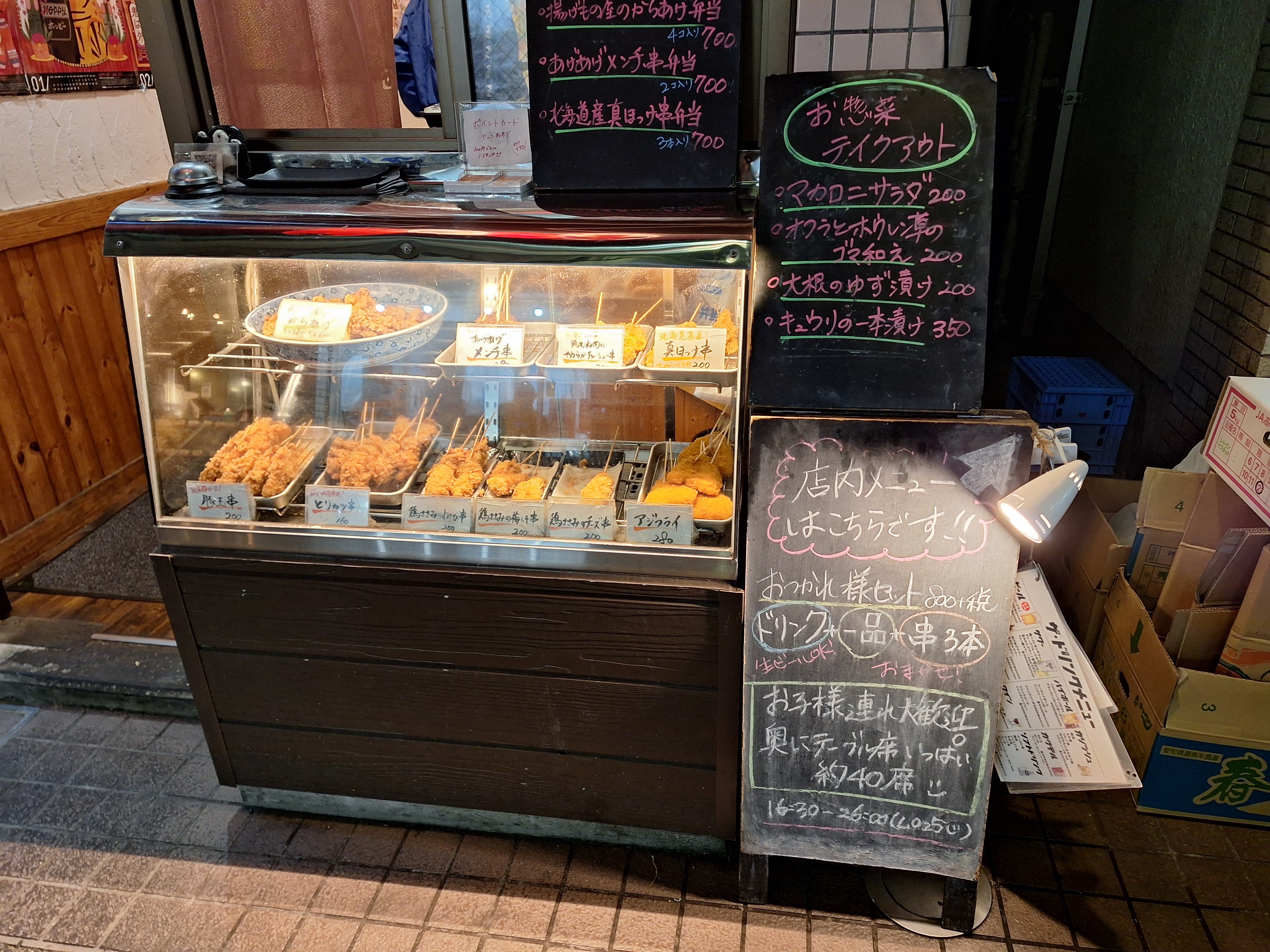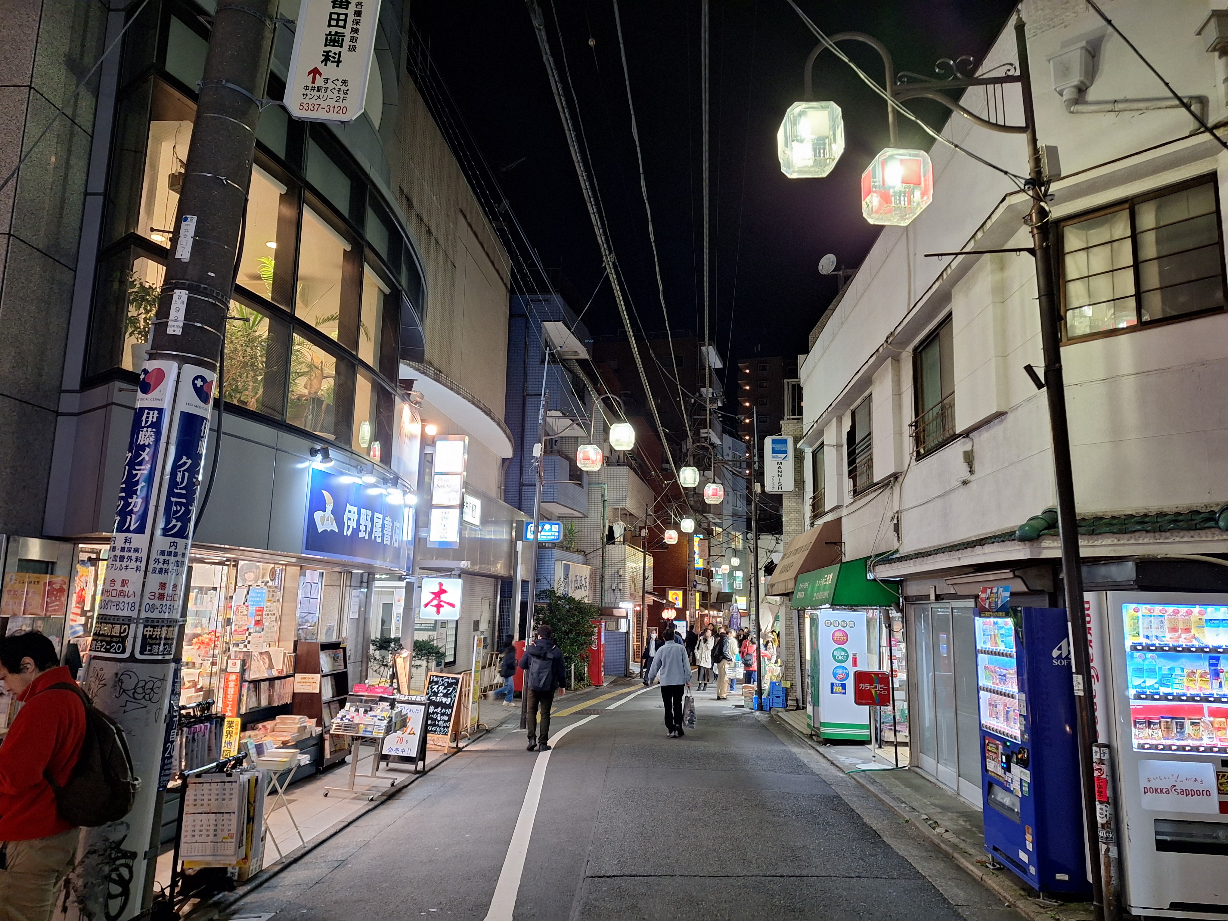 Tokyo. Toujours les petites supérettes. Et comme partout au Japon, un réseau aérien de câbles électriques qui n’est pas très esthétique. Cela nous rappelle l’Amérique du Sud. Mais la raison en est simple: les tremblements de terre. Ils empêchent l’enfouissement dans le sol. En cas de désastre, c’est plus facile d’aller chercher le fil en l’air que sous terre. Toujours des izakayas où on mange pour trois francs six sous.