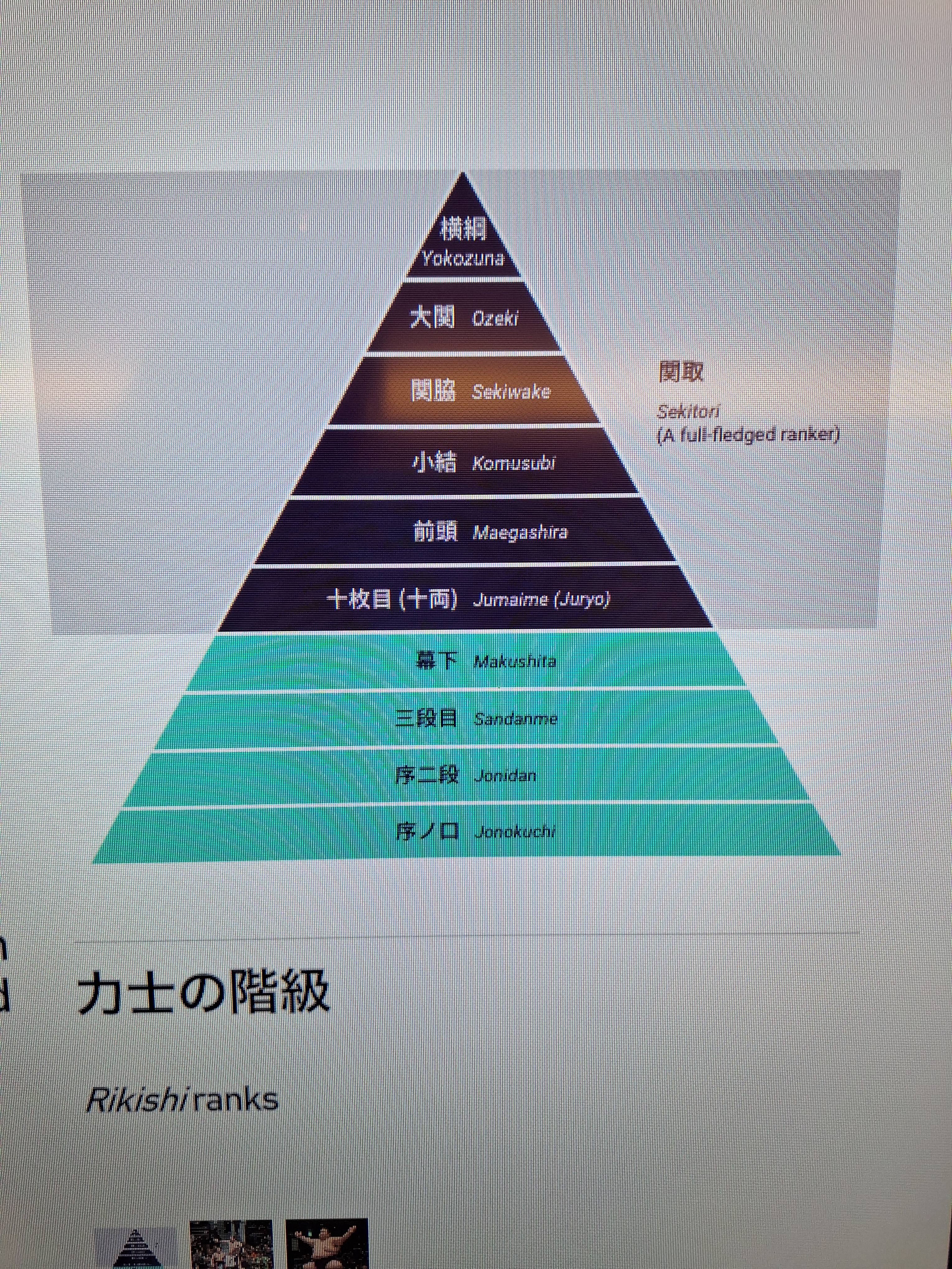 Le stade où se déroulent les combats à Tokyo. Ils n’ont lieu que trois fois par an ici: en janvier, mai et septembre. Un très beau bâtiment qui abrite le musée du sumo. Un peu rachitiques pour des sumotori. Eh bien non. Au Japon on n’emploie pas ce terme pour désigner les lutteurs de sumo. On dit les Rikishis. La hiérarchie parmi les rikishis. Actuellement, il n’y a qu’un seul yokozuna en activité. Grade suprême. Il a été promu en 2021. Depuis le comptage officiel qui a débuté en 1789, il y a eu seulement 73 yokozuna. On ne peut pas perdre ce titre mais si on n’est plus à la hauteur, il faut se retirer de soi-même. Un beau Rikishi. Mais pas Rikiki. Sa jupette ou plutôt son tablier s’appelle un Kesho- Mawashi composé d’une grande pièce de soie et brodée avec des fils de soie, d’or et d’argent. Il est revêtu lors de parades. On retrouve les papillotes blanches des rituels shintoïstes qui ouvrent les tournois et rendent le ring sacré.