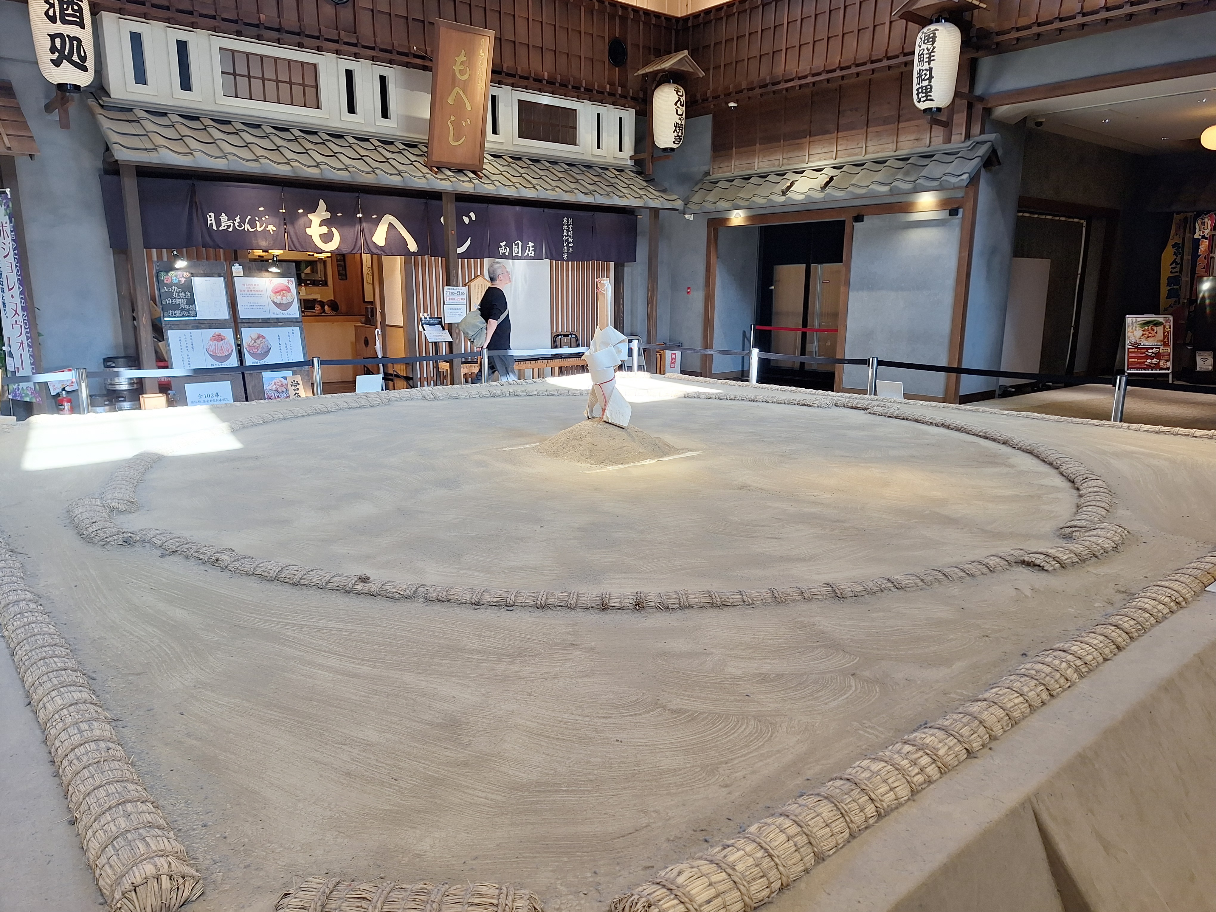 Leur restaurant. Dans un centre commercial, un Dohyô . C’est le ring des Rikishis. Une plateforme recouverte de sable. Ce sont des bottes de paille de riz qui forment le cercle qui mesure 4,55 mètres de diamètre.