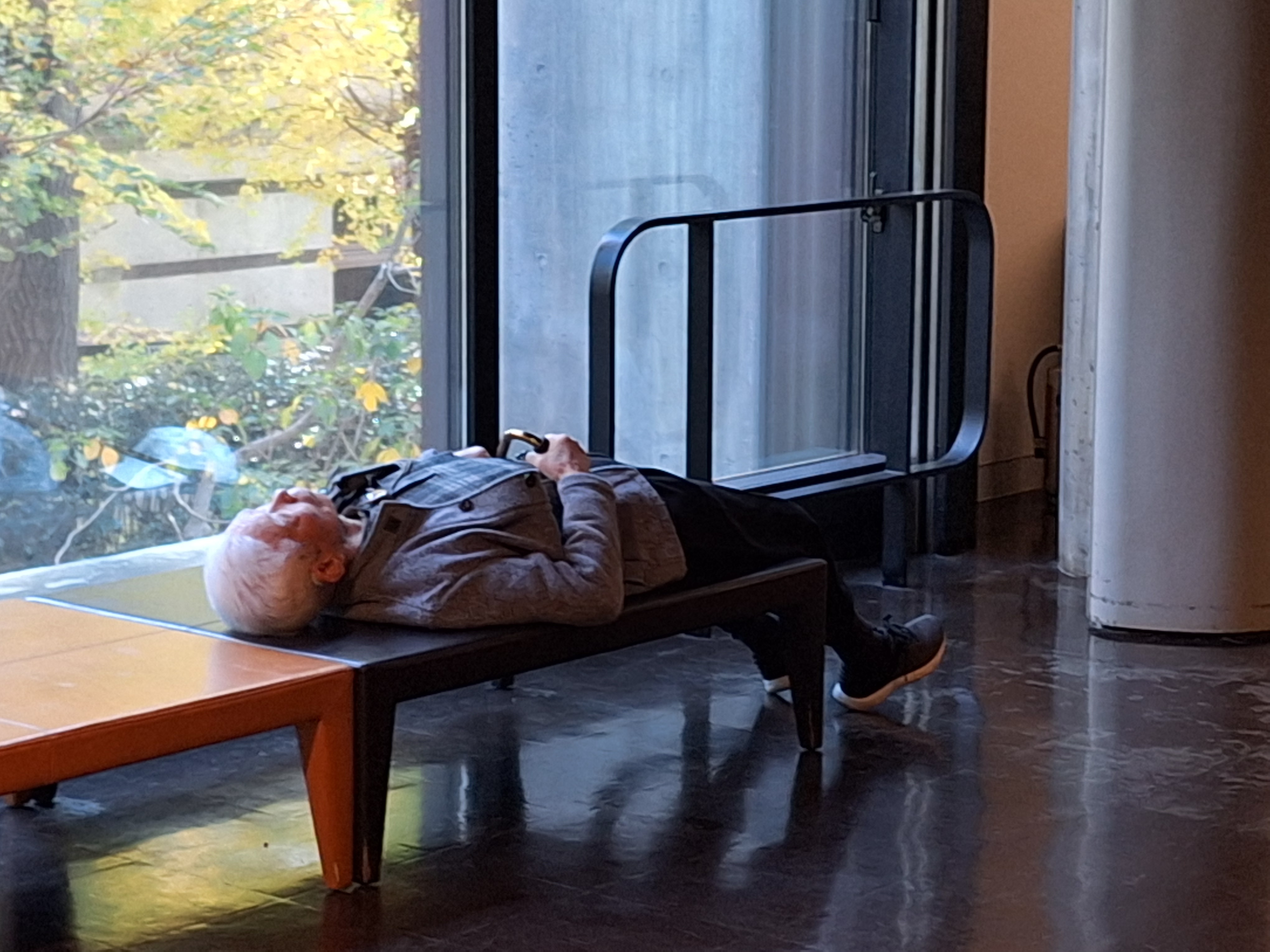 Un coup de fatigue au musée et le gardien laisse le visiteur se reposer.