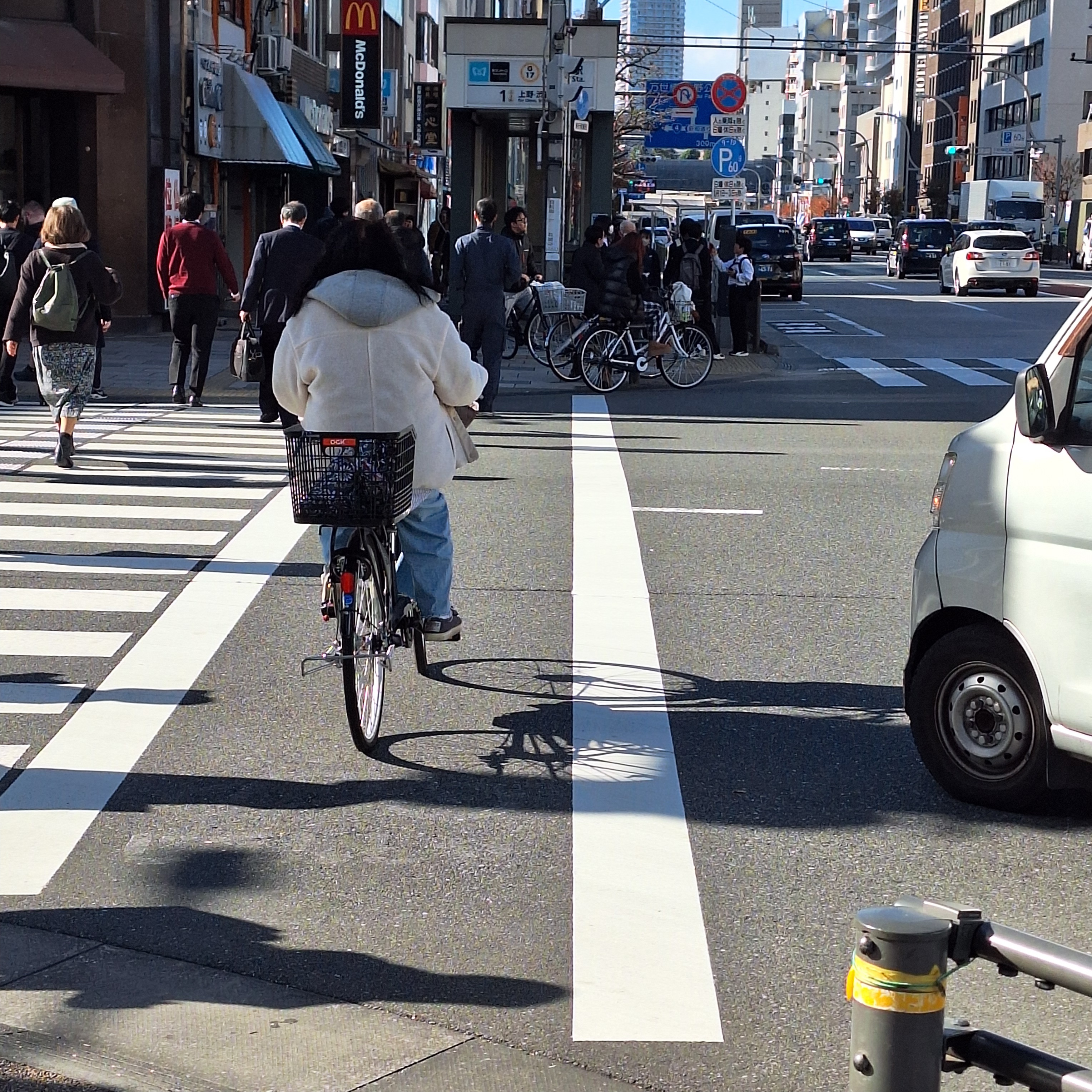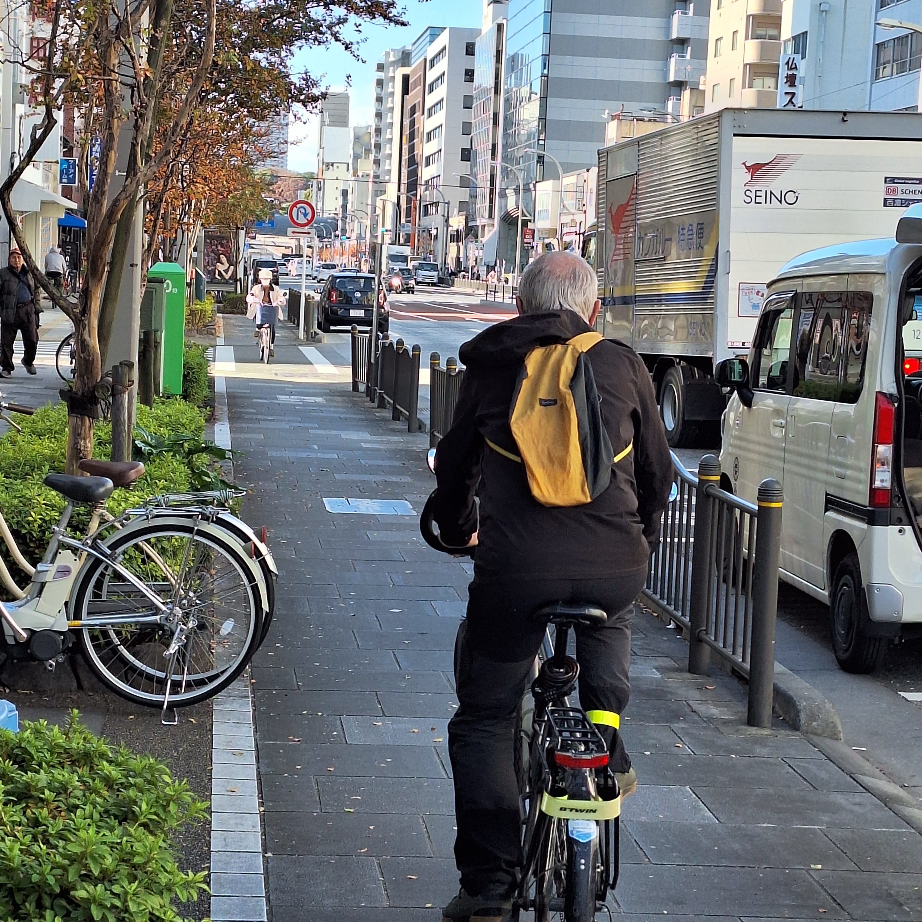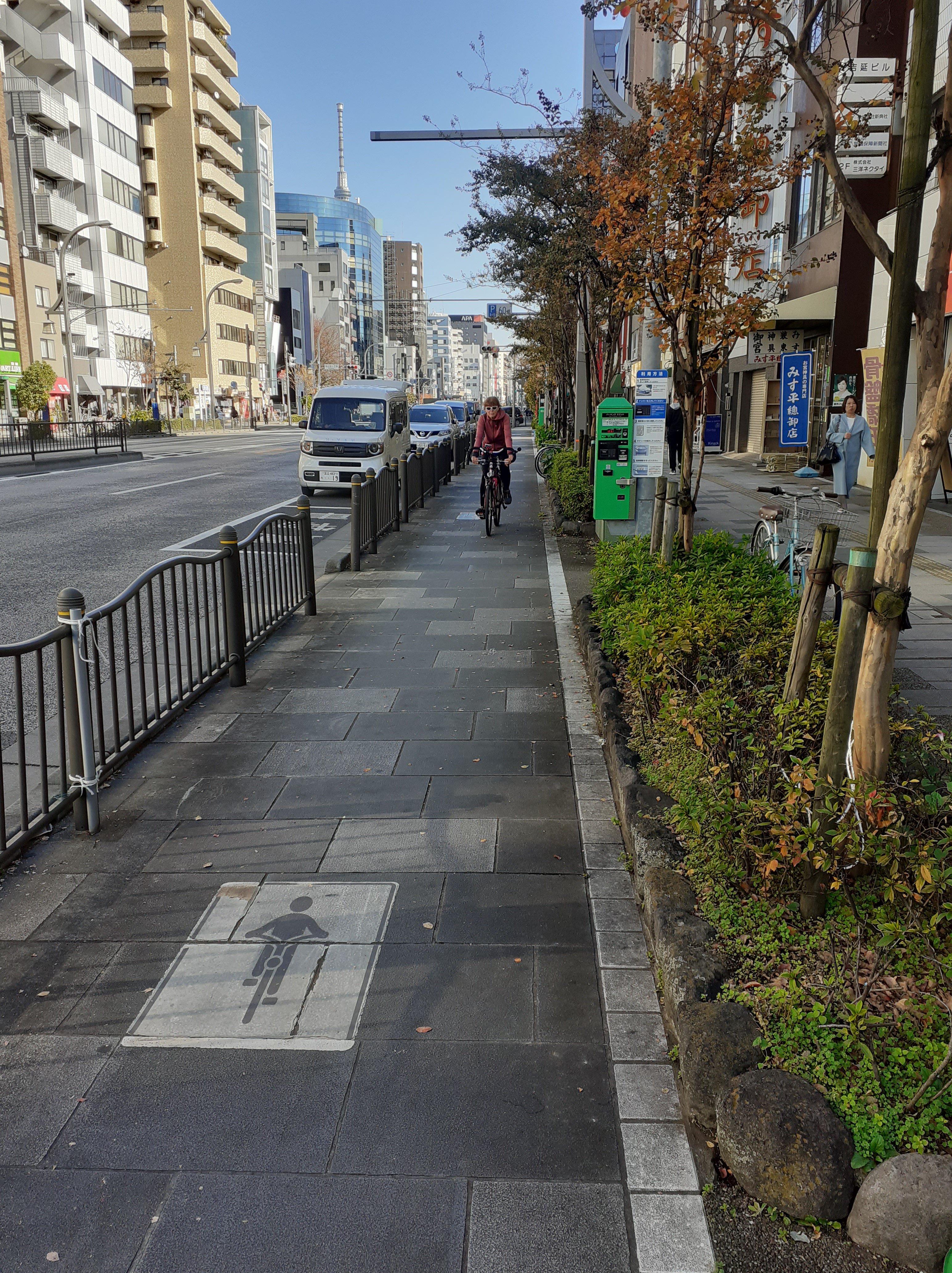 La piste cyclable. En plein cœur de la ville avec la pointe de la Skytree Tower en arrière plan.La bande cyclable. On peut aussi rouler sur les trottoirs très larges quand on voit le logo vélo. Un couloir pour les vélos auprès des passages pour piétons.