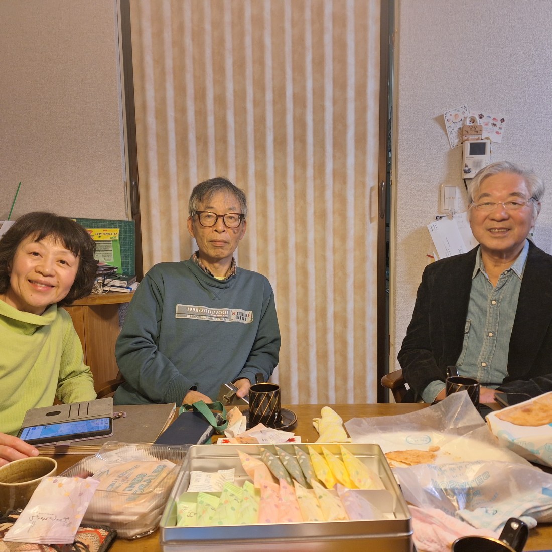 Yochiko, 67 ans qui est la femme de Katashi (74 ans) au centre et Jim, 78 ans, ami invité pour la soirée. Un goûter nous attend avec de délicieux gâteaux japonais et un bon café.