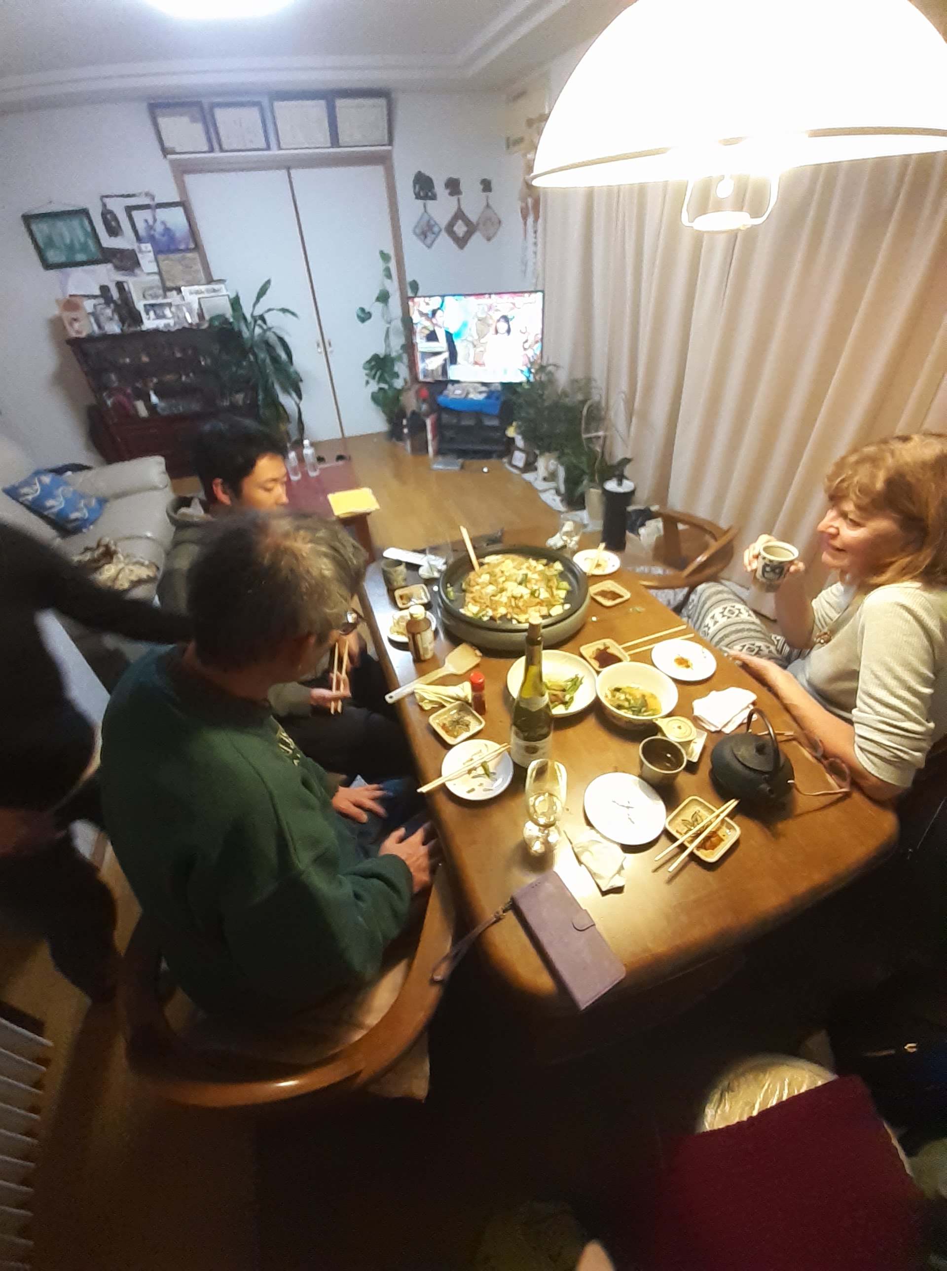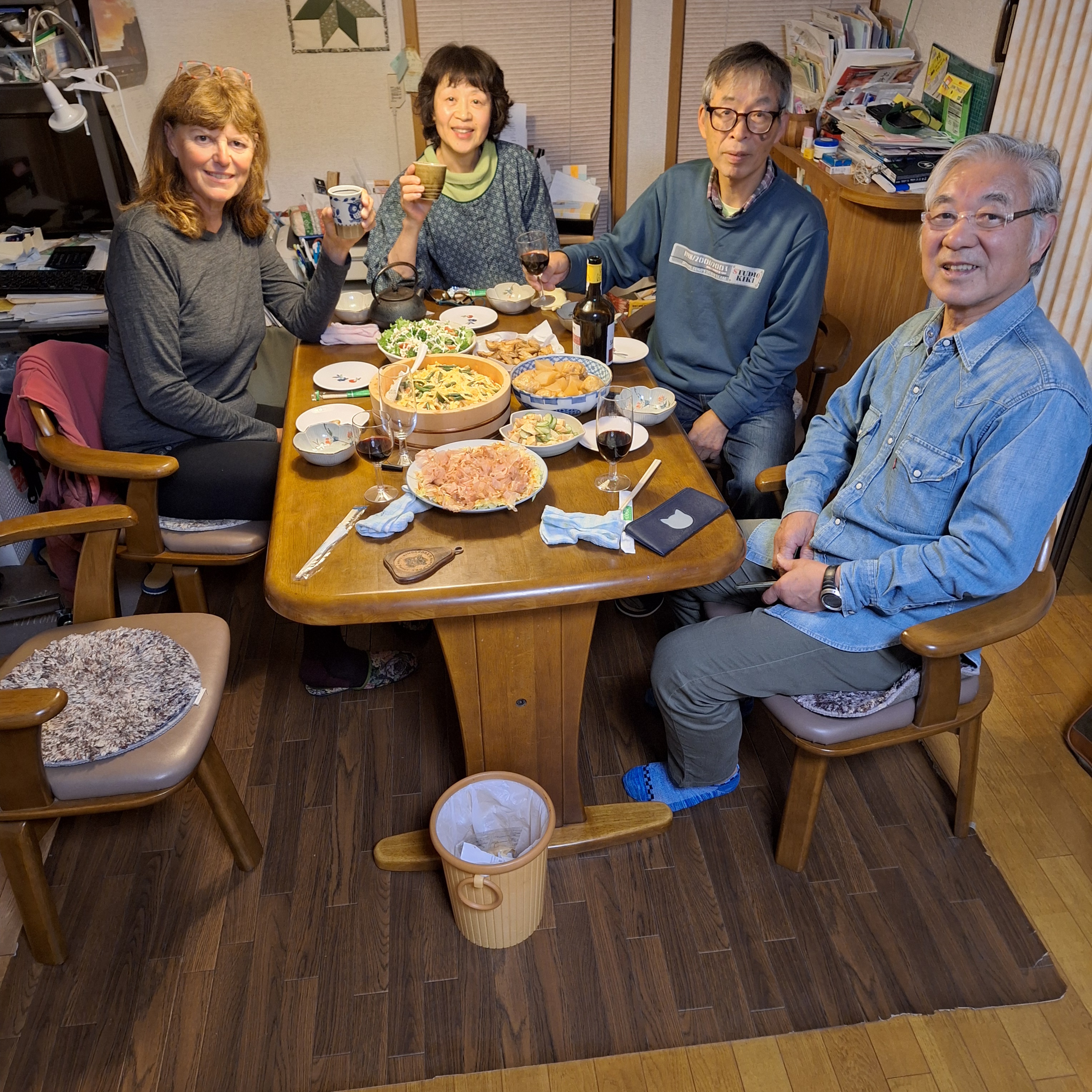 Repas somptueux. À chaque fois on se régale… Yochiko était pharmacienne, Katashi travaillait dans les bureaux d’une compagnie maritime et Jim dans la chimie. Pour avoir une meilleure retraite, Katashi fait de la comptabilité à temps complet. On a papoté de 16 h à 23 heures !