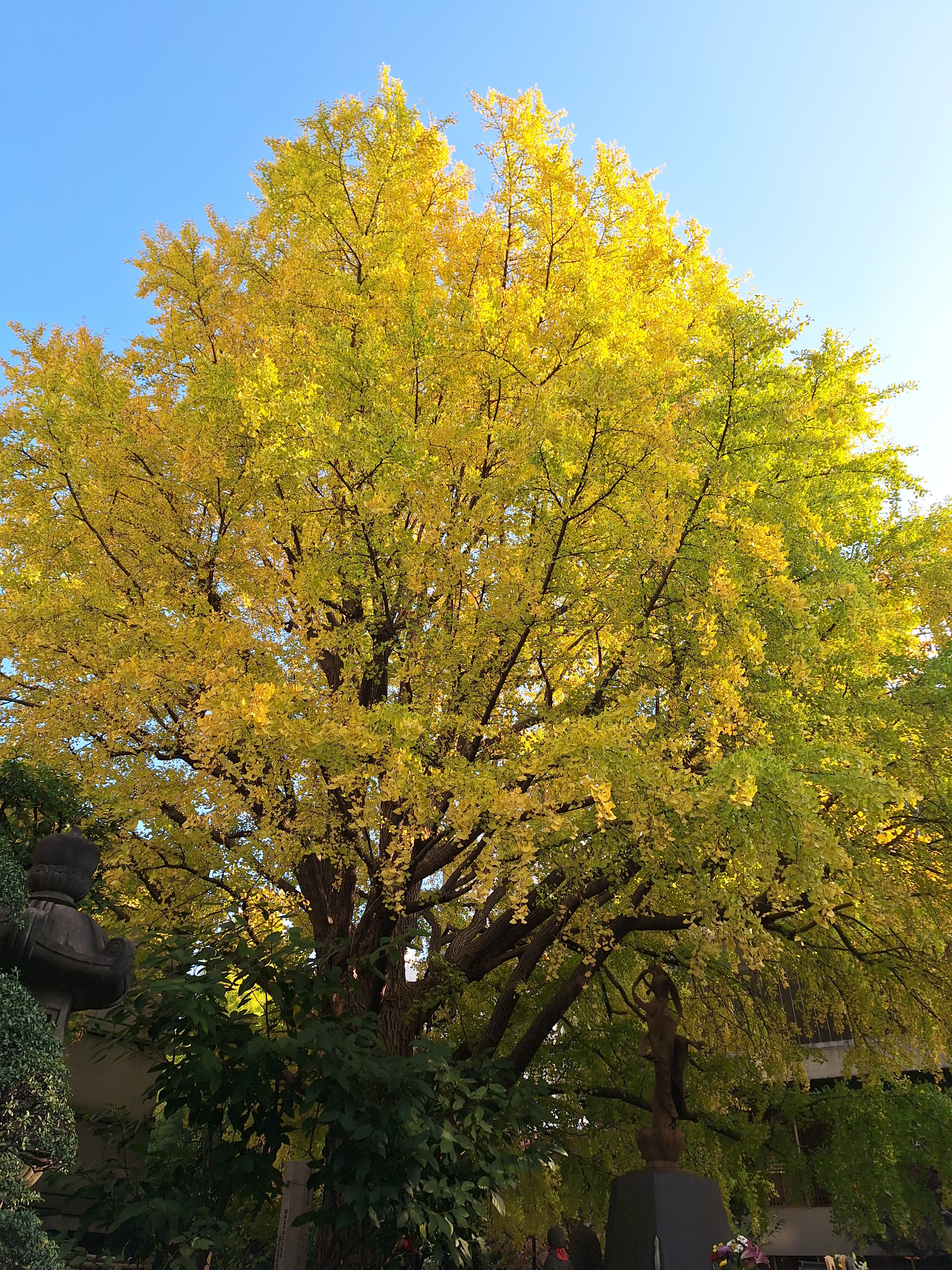 Le Bouddha de Kamakura. Le deuxième plus grand du Japon après celui de Nara. 14 mètres de haut pour 121 tonnes de bronze. Beauté automnale des gingko biloba. Leurs fruits sont utilisés en pharmacopée.En dessert, patate douce et boule de glace….ça passe.