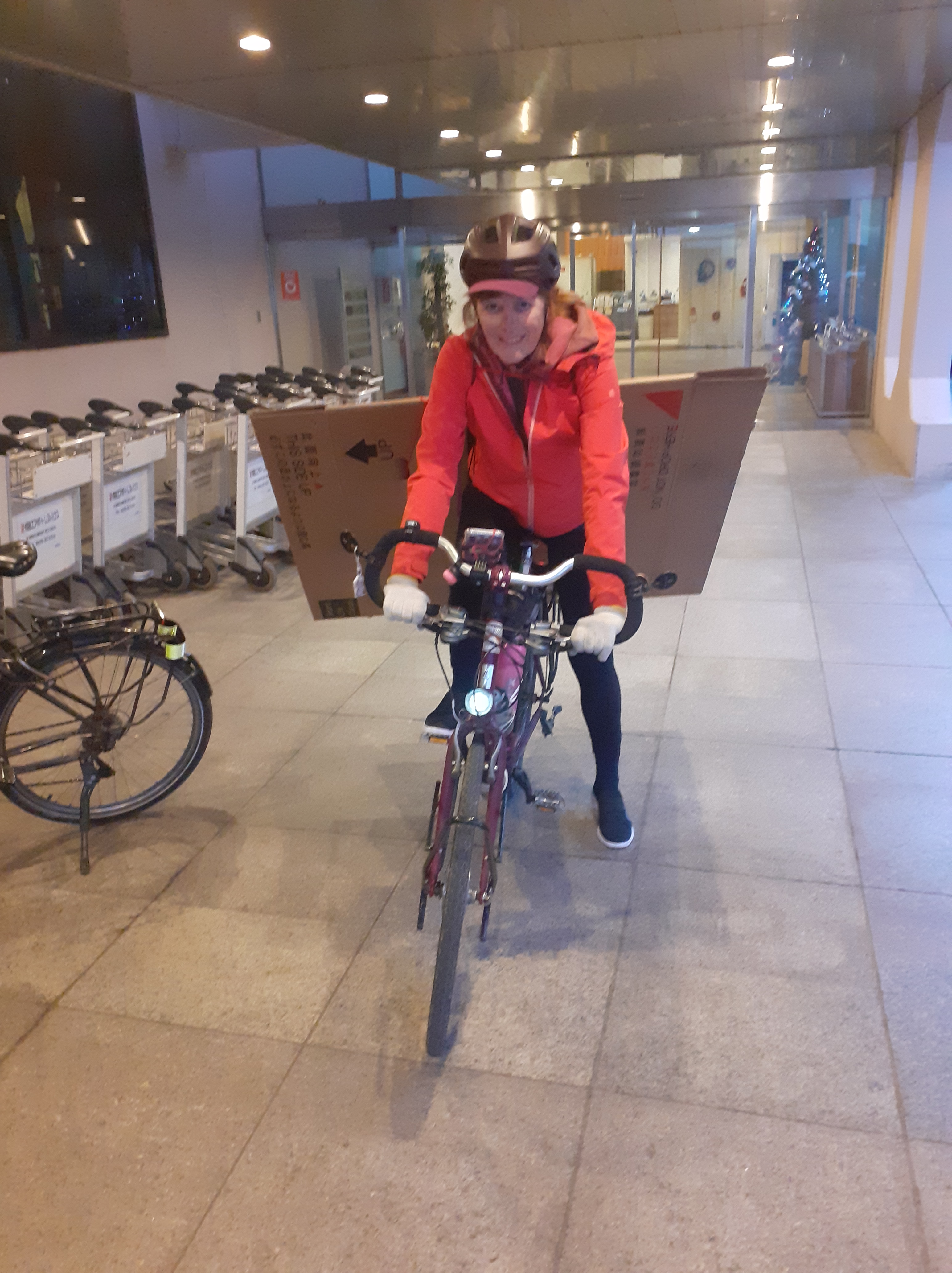 On dégrafe le fonds des deux cartons pour les aplatir. Au magasin de vélos.Il n’y a plus qu’à faire 10 kms comme ça pour rejoindre notre hôtel à 450 m du terminal de l’aéroport. On est arrivés sans encombres à bon (aéro) port. Sauvée par les cordons rouges conservés depuis le musée de la Nouille !