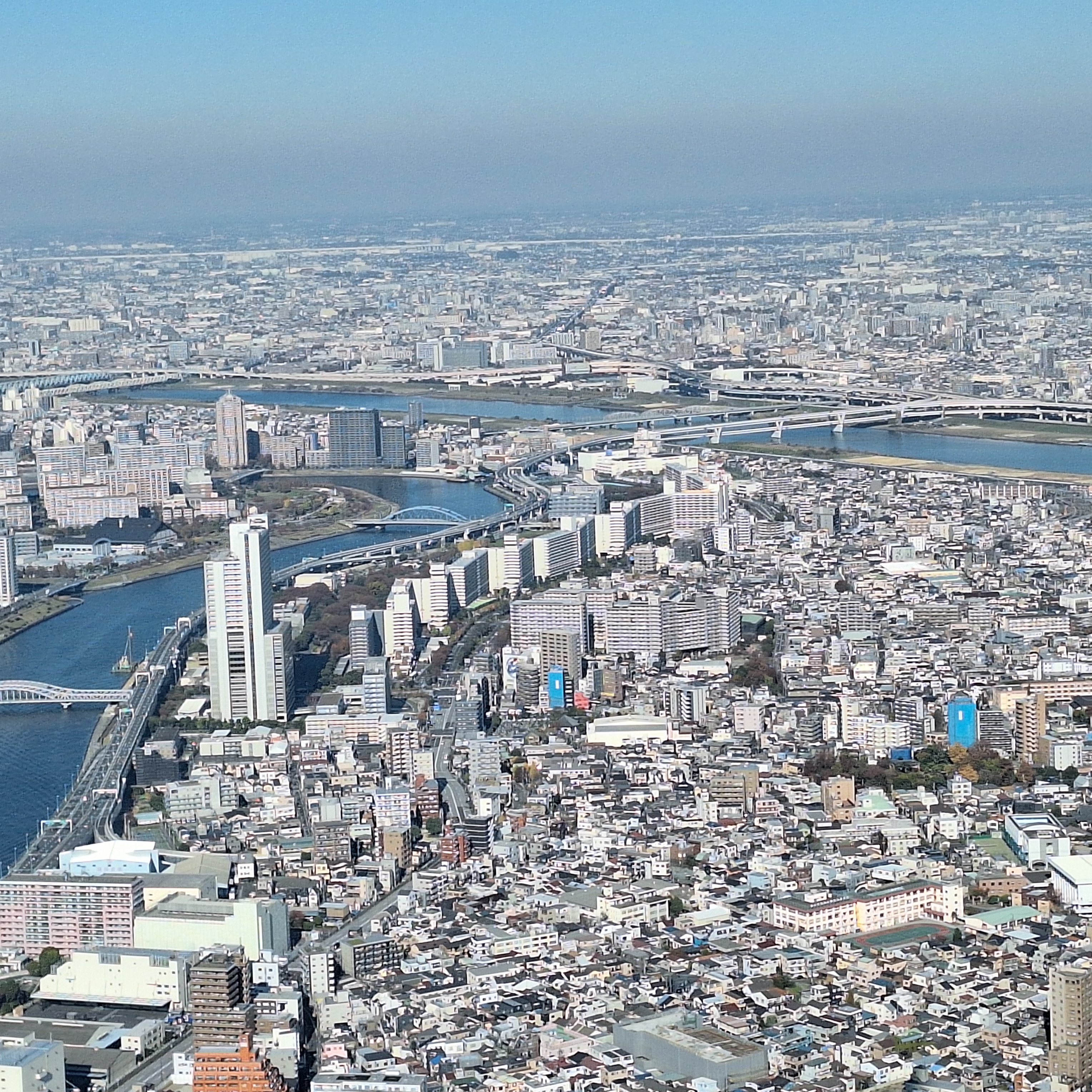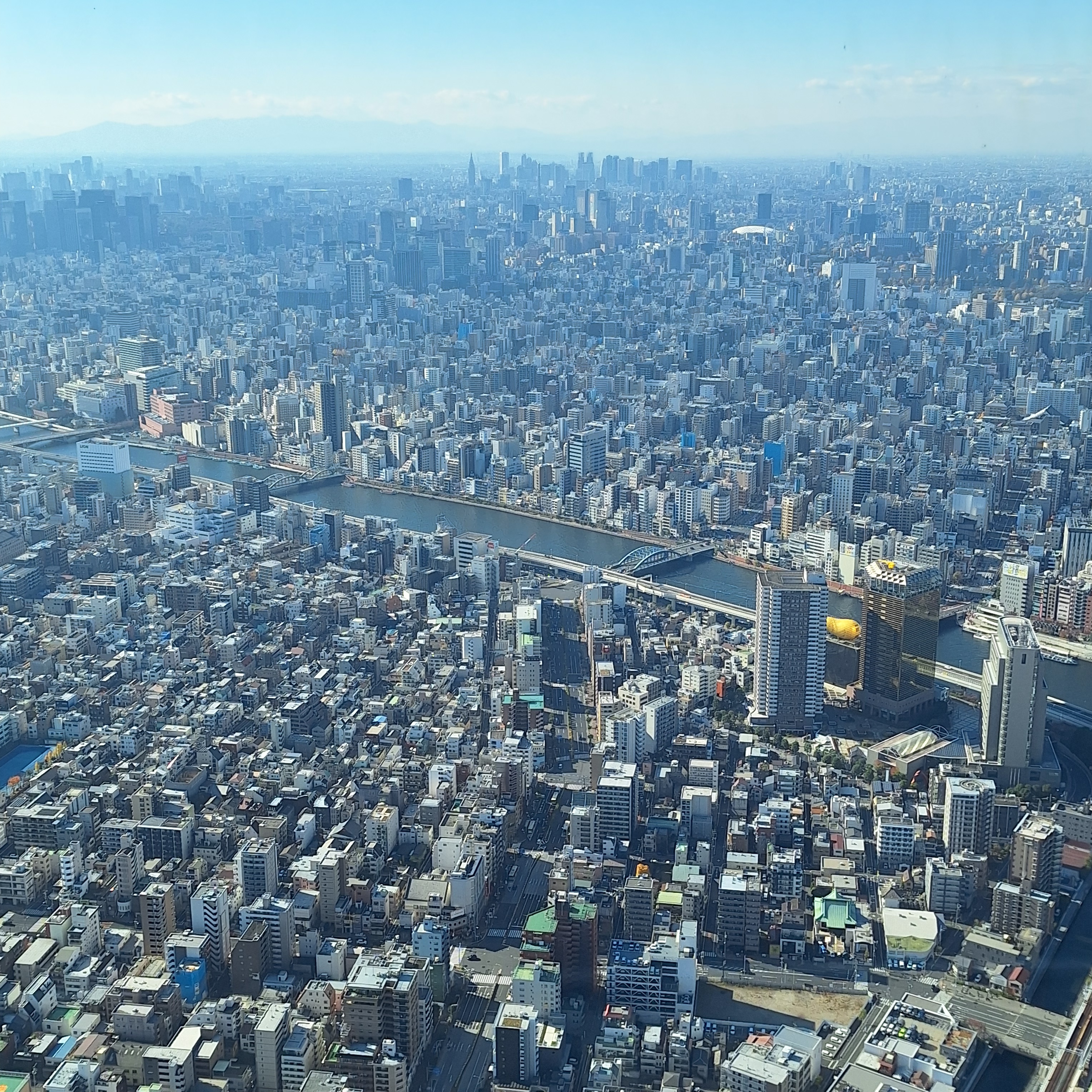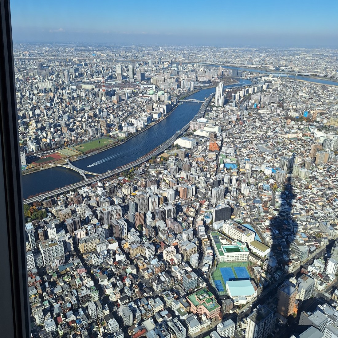 Un groupe qui se débrouille très bien tant pour la danse que pour les voix chantées. Et puis le phare de la ville. Le repère. L’arbre du ciel. The Skytree.Un marché de Noël dans ses premiers étages.Elle est la plus haute tour de télécommunications du monde. Elle mesure 634 m, deux Tours Eiffel mais on ne grimpe que jusqu’à 450 m. Construite de 2009 à 2012, elle est faite pour résister aux tremblements de terre. Au centre, une énorme colonne de béton suspendue comme un pendule. En cas de séisme, elle oscille et amortit les ondes de choc. On la sent bouger.Confluences. Tokyo est construite sur l’eau, d’où les marais qu’on a traversés en pédalant vers Narita. Quatre fleuves émaillent la ville : Arakawa, Sumidagawa, Edogawa et Tamagawa. Sous ses gratte-ciel, des centaines de rivières et canaux.Quand l’horizon est dégagé, on aperçoit le mont Fuji. Bon, on ne peut pas toujours gagner…